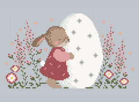 Entre fleurs champêtres et œufs décorés, ces deux petits lapins s’enlacent avec tendresse dans un décor printanier.