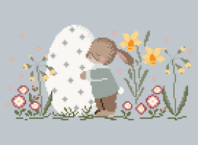 Entre fleurs champêtres et œufs décorés, ces deux petits lapins s’enlacent avec tendresse dans un décor printanier.
