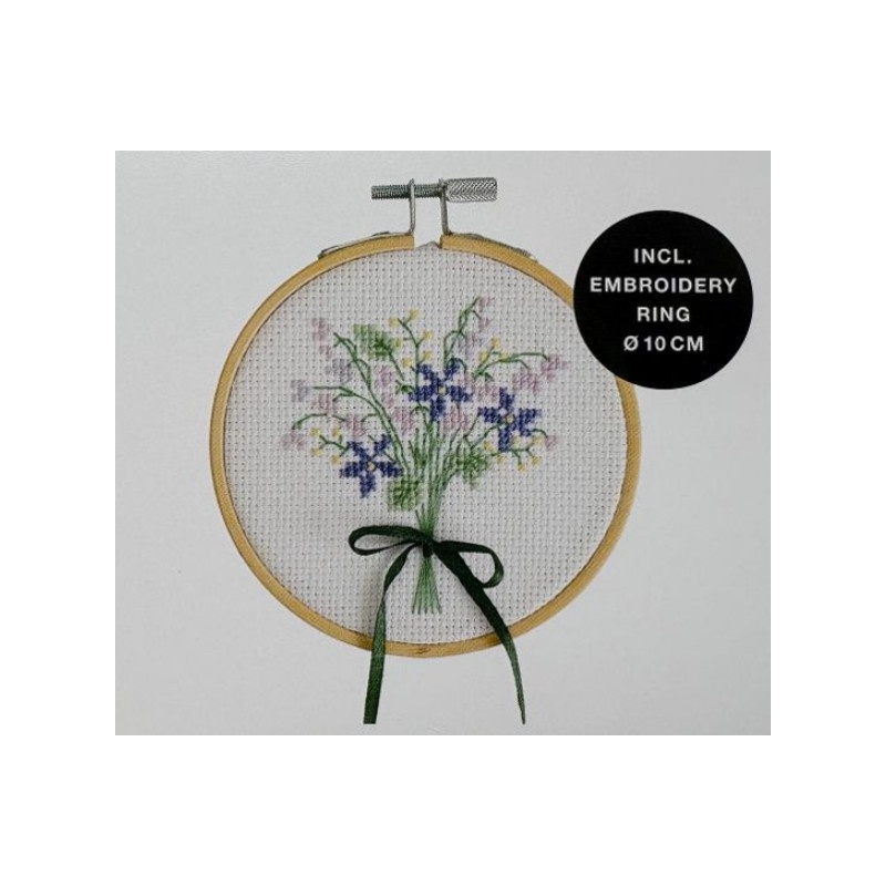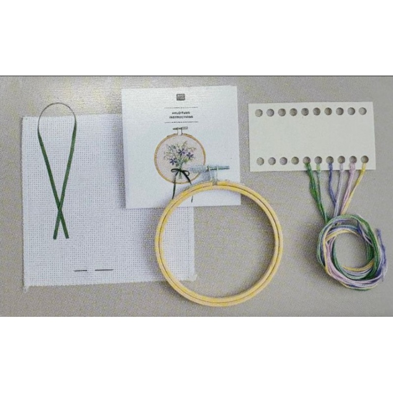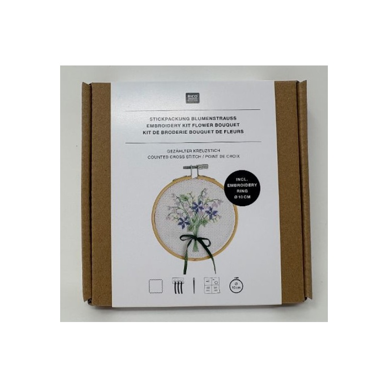 Le kit contient : Toile à broder aïda 5.4 pts/cm 100% coton 15 x 15 cm, Tambour à broder de diamètre 10cm, fils à broder, ruban satin, aiguille et instruction