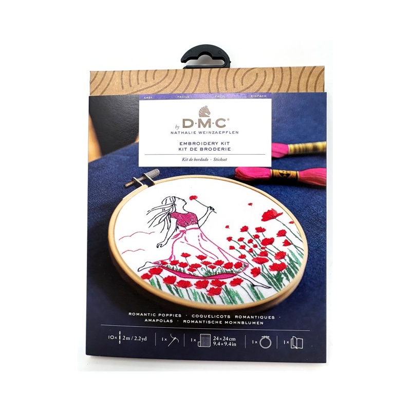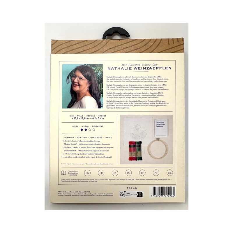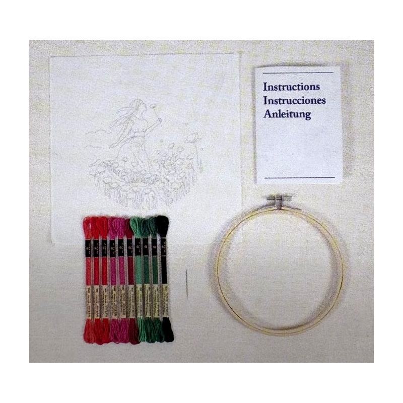 Le kit contient : les instructions, la toile imprimée de 24 x 24 cm (100% coton), 10 échevettes de fils DMC moulinés de 2m , un tambour de diamètre 14.5 cm, et l'aiguille à broder