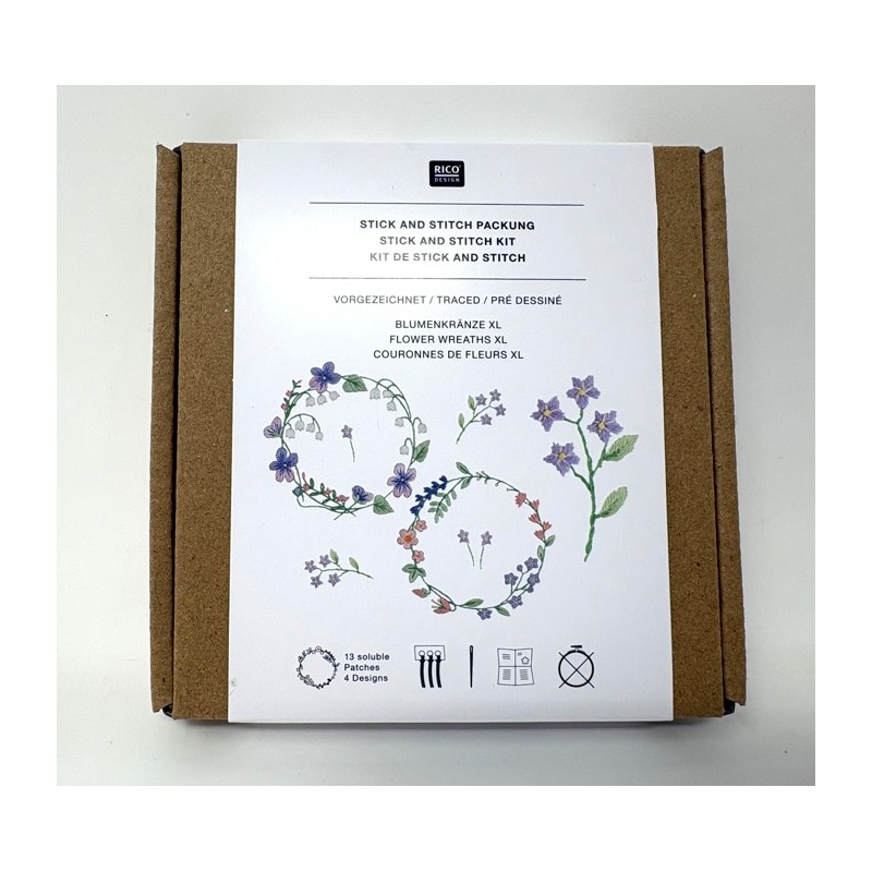 Le kit contient : entoilage autocollant imprimé et soluble à l'eau, mouliné 100% coton, aiguille et instructions