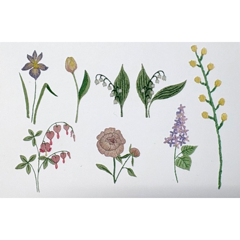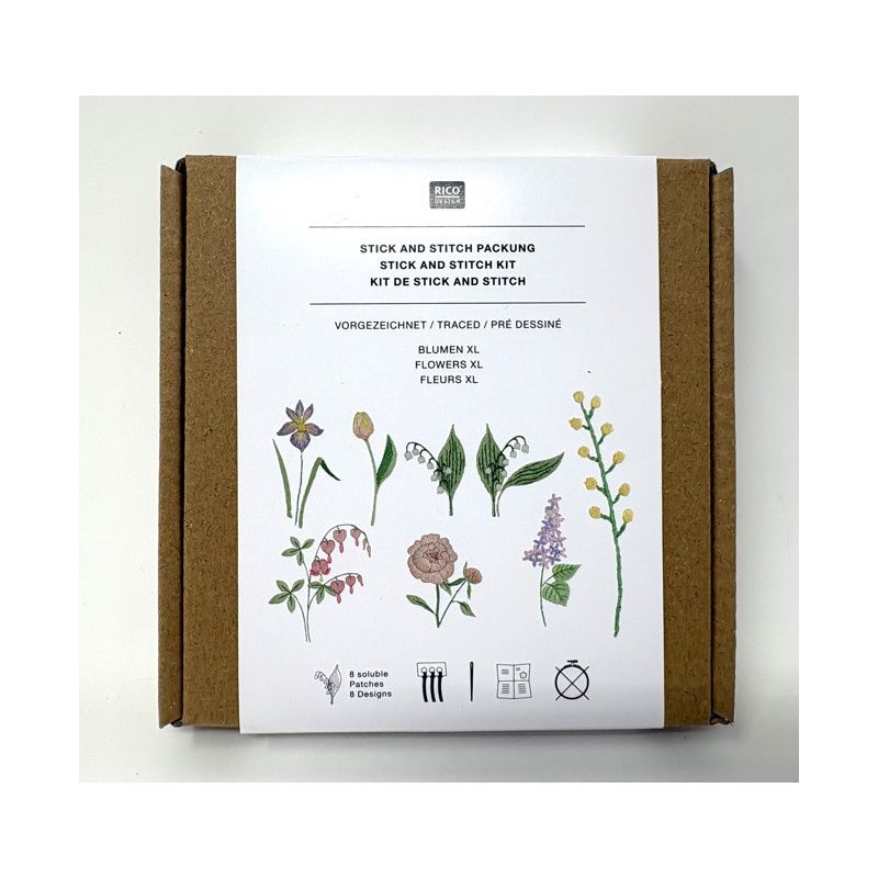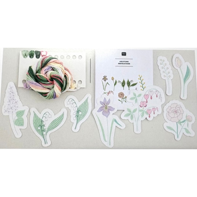 Le kit contient : entoilage autocollant imprimé et soluble à l'eau, mouliné 100% coton, aiguille et instructions