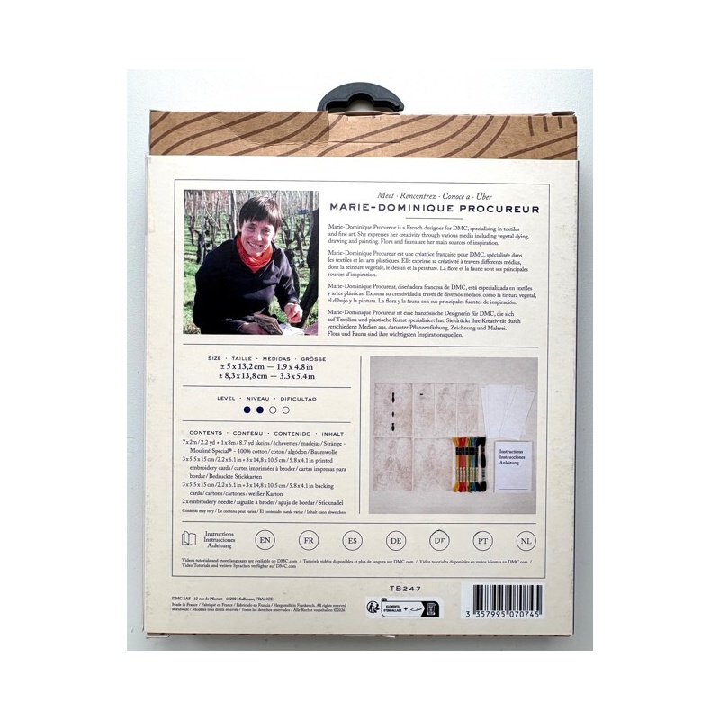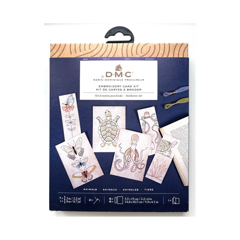 Le kit contient : les instructions, les cartes à broder 3X (5.5 X 15 cm) et 3X (14.8 X 10.5 cm), 7 échevettes de fils DMC moulinés de 2m et 1 échevette de 8m , cartons blancs 3X (5.5 X 15 cm) et 3X (14.8 X 10.5 cm), et 2 aiguilles à broder