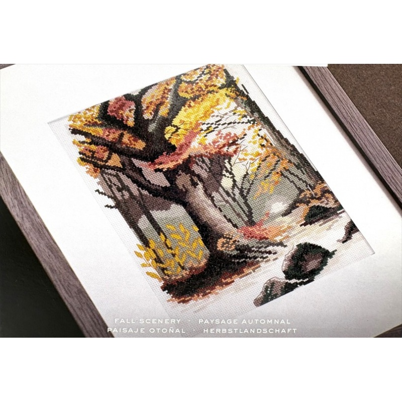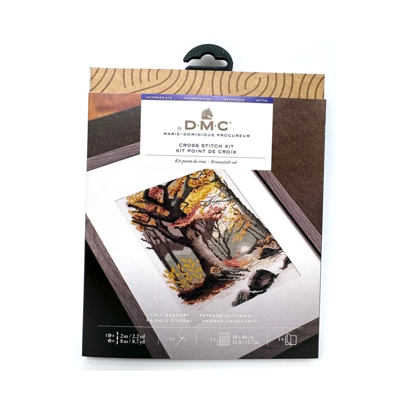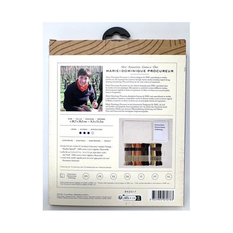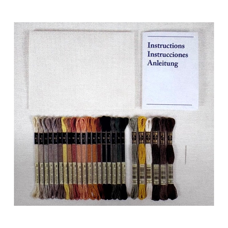 Le kit contient : le diagramme et instructions pour le modèle de point de croix, 1 morceau de toile (aida 5.5 pts) de 30 X 40 cm, 19 échevettes de fils DMC moulinés de 2m, 6 échevettes de fils DMC de 8m, et l'aiguille à point de croix