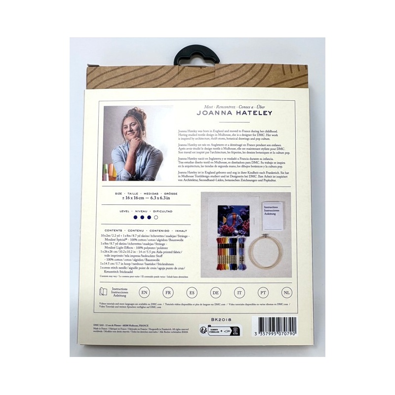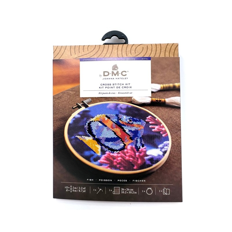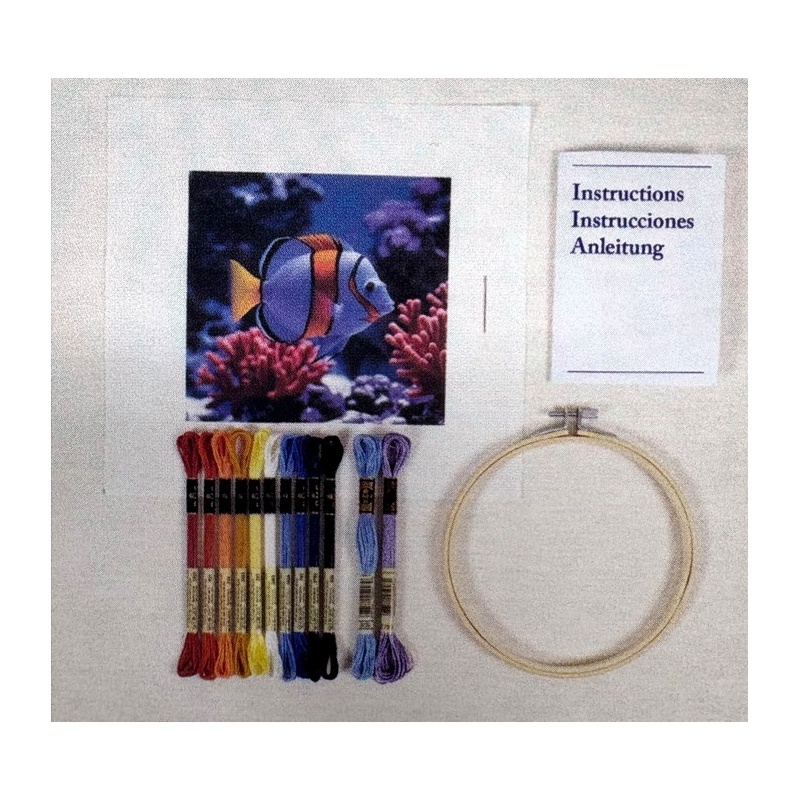 Le kit contient : le diagramme et instructions pour le modèle de point de croix, 1 morceau de toile imprimée (aida 5.5 pts) de 26 X 26 cm, 10 échevettes de fils DMC moulinés de 2m, 2 échevettes de fils DMC de 8m, le tambour à broder de 14.5 cm de diamètre, et l'aiguille à point de croix