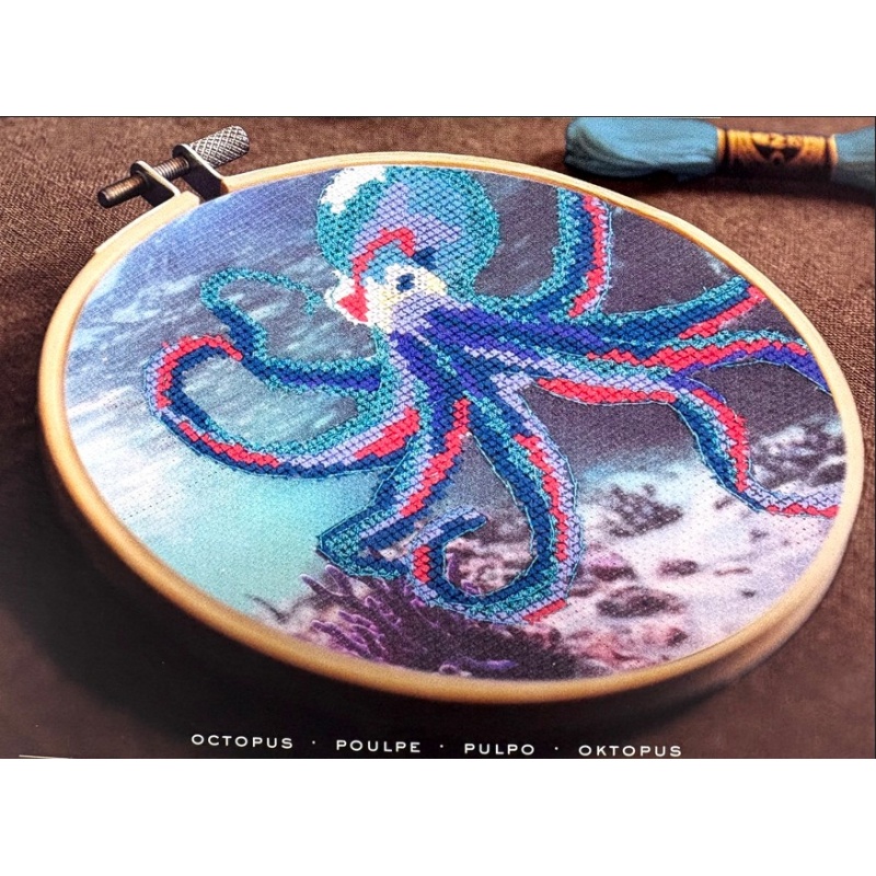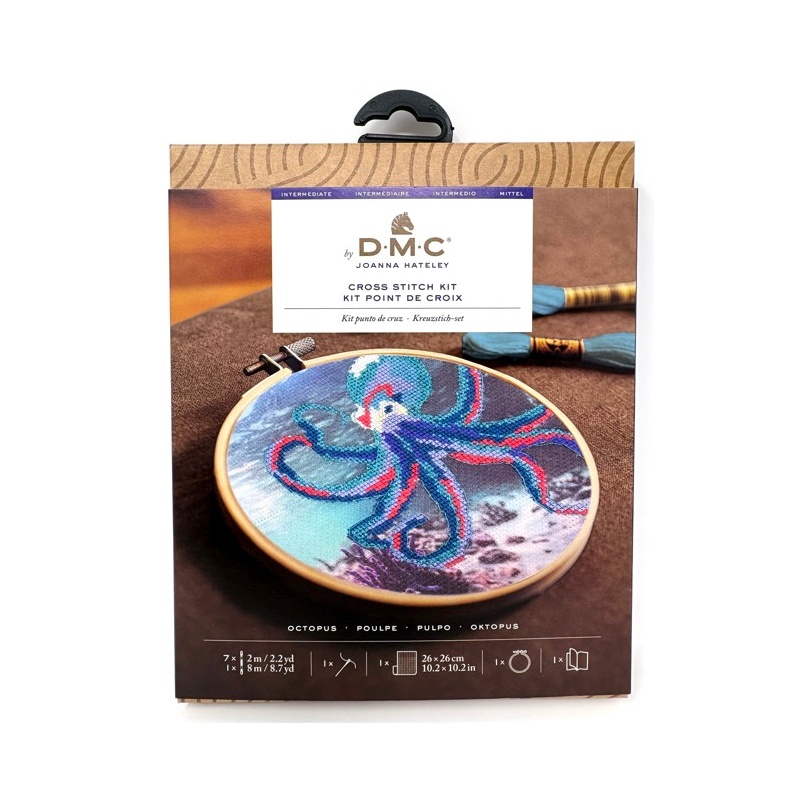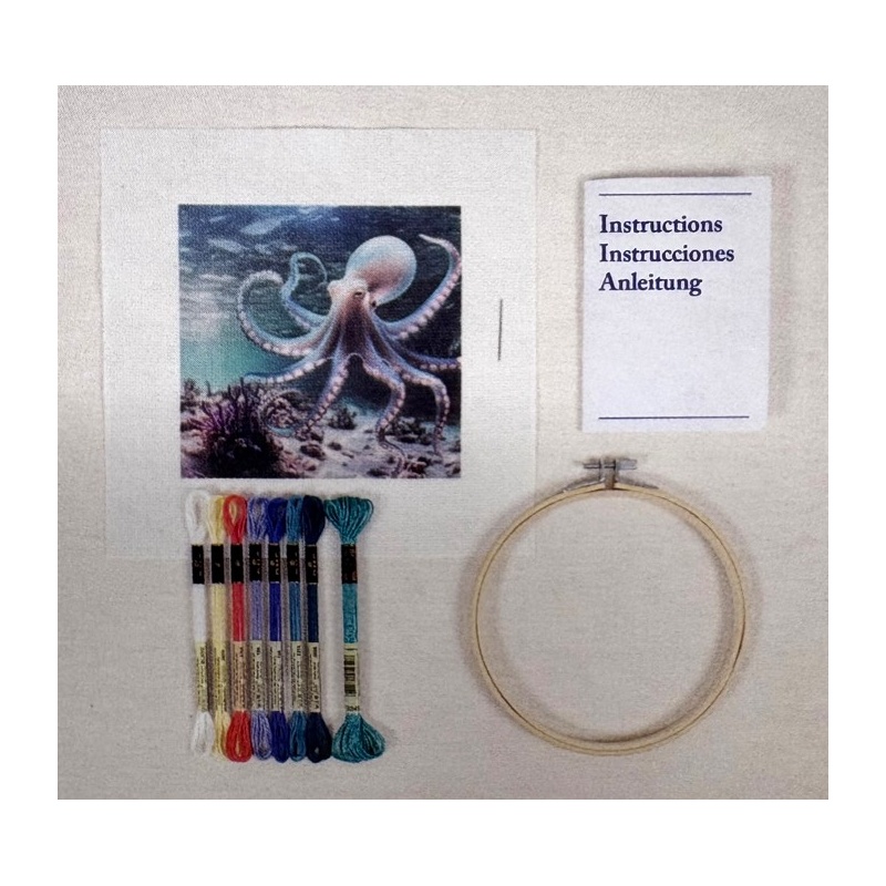 Le kit contient : le diagramme et instructions pour le modèle de point de croix, 1 morceau de toile imprimée (aida 5.5 pts) de 26 X 26 cm, 7 échevettes de fils DMC moulinés de 2m, 1 échevette de fils DMC de 8m, le tambour à broder de 14.5 cm de diamètre, et l'aiguille à point de croix