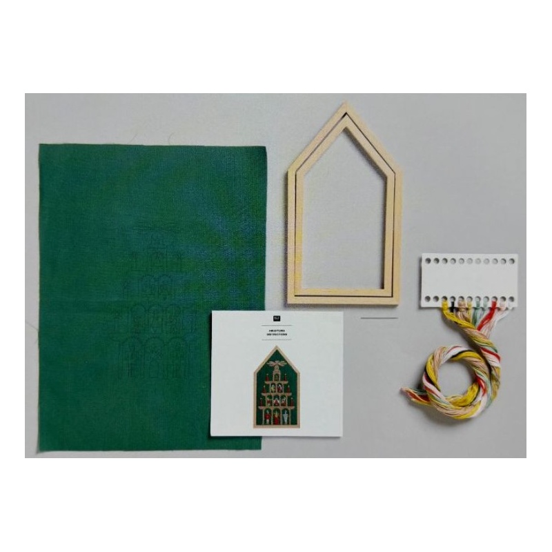 Le kit contient : Cadre décoratif de 12.5 X 22.5 cm , toile pré-imprimée 25 X 34 cm 100% coton, mouliné 100% coton, aiguille et instruction