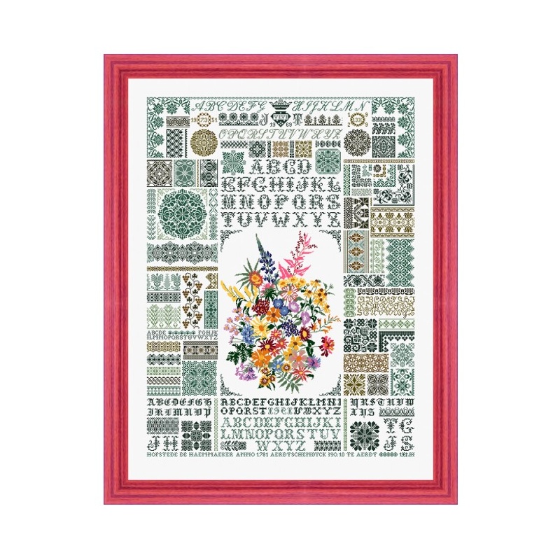 Dimension de la broderie : 461 X 625 pts soit sur une toile de lin 14 fils/cm et sur 2 fils de trame (ou aïda 7 pts) : 65.8 X 89.3 cm