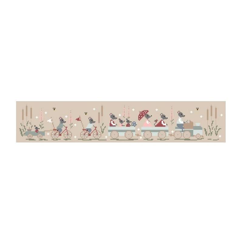 Dimension de la broderie : 270 X 48 pts soit sur une toile de lin 12 fils/cm (ou aïda 6 pts) : 45 X 8 cm,