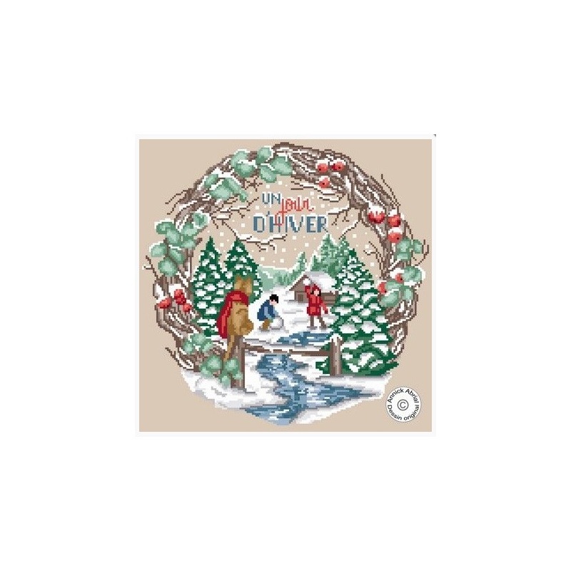 Grille de broderie en point de croix , point compté représentant Une couronne avec un paysage d'Hiver.